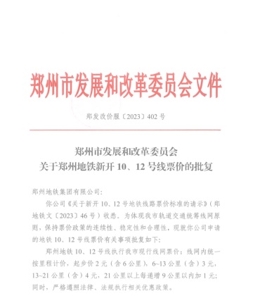 鄭州市發(fā)展和改革委員會(huì)關(guān)于鄭州地鐵新開10、12號(hào)線票價(jià)的批復(fù)